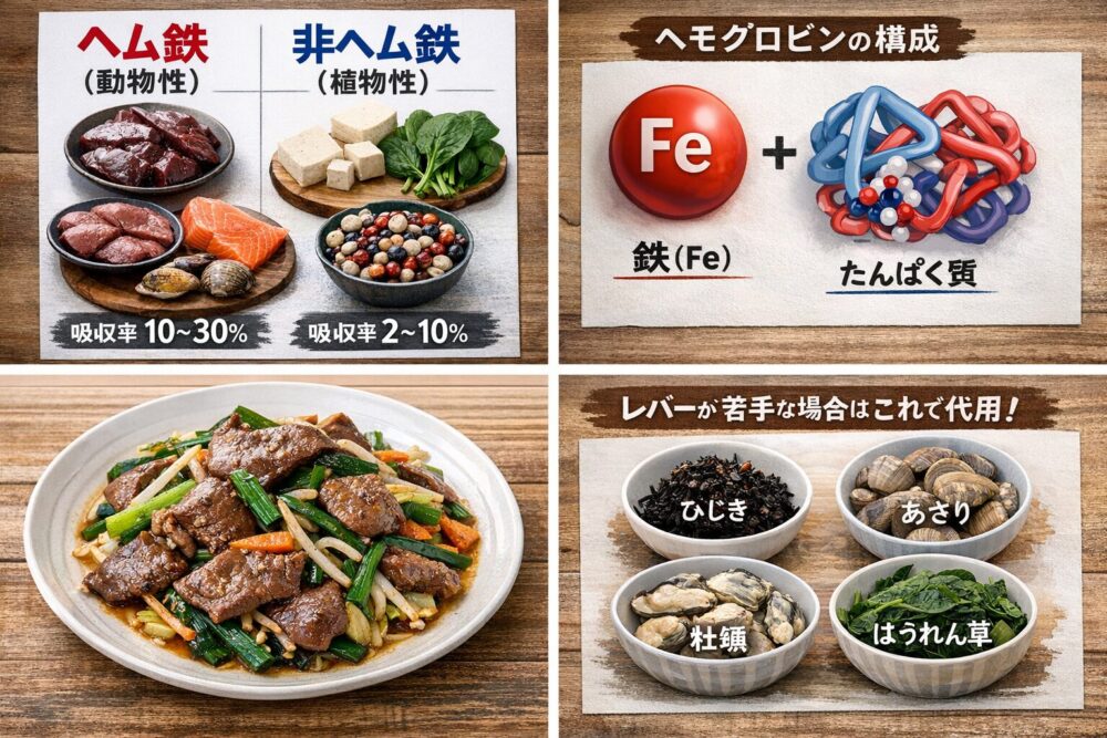 特に非ヘム鉄は、たんぱく質やビタミンと一緒に摂ることで吸収率が高まります。