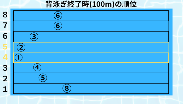 背泳ぎのラップタイム1位は5レーンの選手ですね。