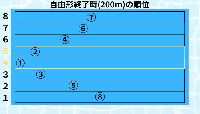 ここで5レーンの選手が追い上げているのがわかりますね。