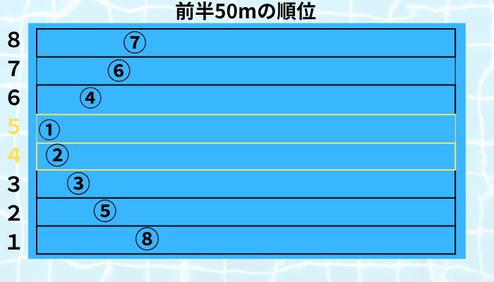あと2人3レーン、6レーンの選手まで前半50mを27秒台と全体的にハイレベルな前半ですね。